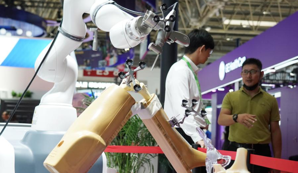 An AI-powered orthopedic surgical robot is seen in the Healthy Life Chain area of the third China International Supply Chain Expo (CISCE) in Beijing, capital of China, July 17, 2025. (Xinhua/Zhang Chenlin)