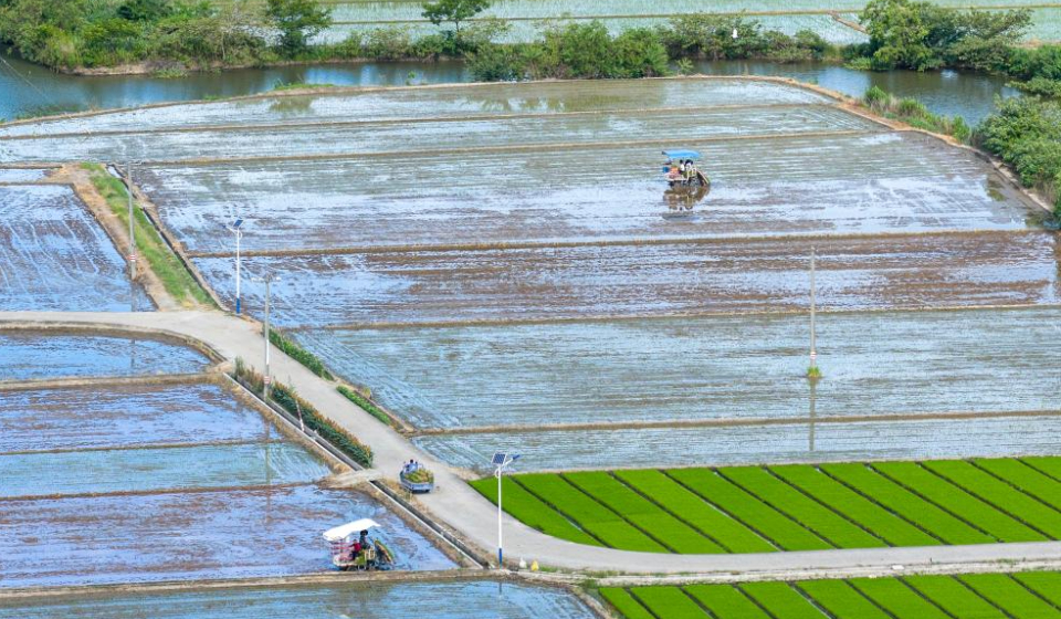 An aerial drone photo taken on July 21, 2025 shows villagers driving transplanters to plant rice seedlings in Yuyao, east China's Zhejiang Province. Farmers across the country are busy with agricultural production in the farming season around Dashu, or the Great Heat, the 12th of traditional Chinese 24 solar terms falling on July 22 this year. (Photo by Zhang Hui/Xinhua)