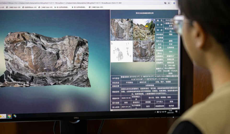 A staff member operates multi-source digital management platform for Helan Mountain cliff paintings in Yinchuan, northwest China's Ningxia Hui Autonomous Region, July 23, 2025. Helan Mountain is noted for more than 20,000 cliff paintings and carvings created by the nomads that once lived in northern China. These works depict herding, hunting, sacrificial rites and the lives of the people who lived 3,000 to 10,000 years ago. Images of animals dominate, followed by humans, vehicles, plants, planets, fingerprints and abstract signs.