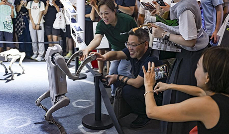 Visitors interact with a robot dog at the 2025 World AI Conference (WAIC) in east China's Shanghai, July 29, 2025. (Xinhua/Chen Haoming)