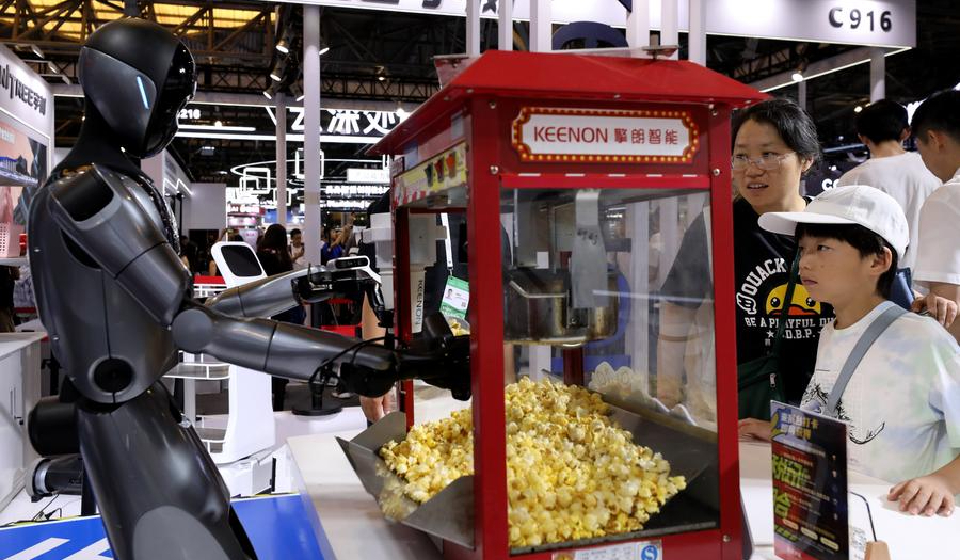Visitors watch a robot working at a popcorn stand at the 2025 World AI Conference (WAIC) in east China's Shanghai, July 29, 2025. (Xinhua/Fang Zhe)