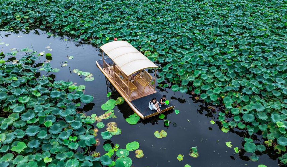 An aerial drone photo taken on Aug. 13, 2025 shows a view of a lotus pond scenic area in Xinghua City, east China's Jiangsu Province. People enjoy their summer time by travelling around the country. (Photo by Zhou Shegen/Xinhua)