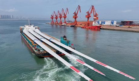 An aerial drone photo taken on Aug. 1, 2025 shows oversized offshore wind turbine blades being transported from Yantai Port in east China's Shandong Province. (Photo by Tang Ke/Xinhua)