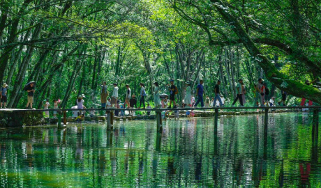 With lush stretches of Chinese wingnut trees and the winding Fengle River shimmering with emerald waves, Xixinan Ancient Village in Huangshan City, east China’s Anhui Province, draws numerous visitors to enjoy the idyllic ecological scenery on August 14, 2025. (Shi Yalei/Guangming Pictures)