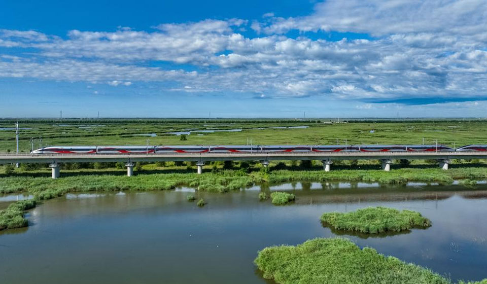 This drone photo taken on Aug. 17, 2025 shows a high-speed train running along the Harbin-Qiqihar railway. On Aug. 17, 2015, the Harbin-Qiqihar railway, Heilongjiang's first high-speed railway, from the provincial capital Harbin to Qiqihar City, was put into operation and became China's northernmost of its kind in operation in the northeastern province of China.