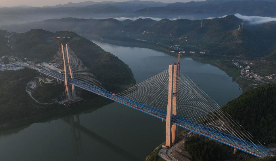 An aerial drone photo taken on Aug. 18, 2025 shows a worker at the construction site of Hanjiang River bridge of Xi'an-Shiyan high-speed railway in Shiyan City, central China's Hubei Province. Hanjiang River bridge, a key project for the Xi'an-Shiyan high-speed railway, finished the installation of steel-truss girders on Monday.