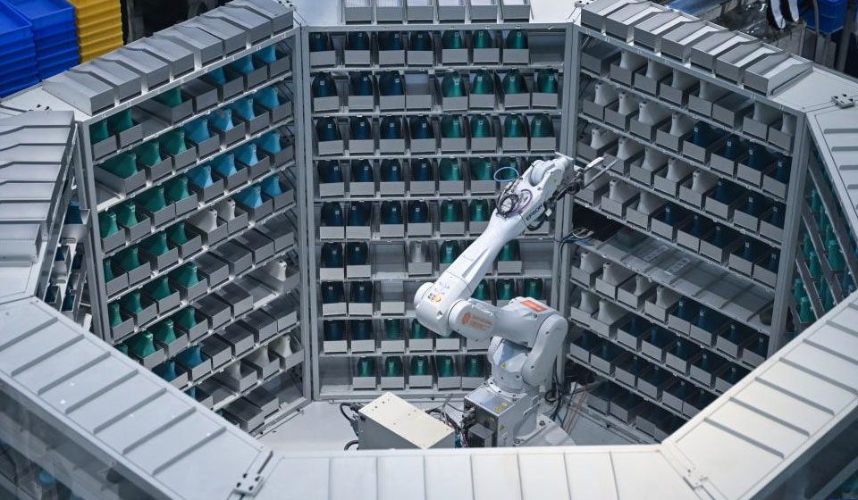 A mechanical arm is seen at the smart workshop of a footwear company in Putian, southeast China's Fujian Province, Aug. 19, 2025. At a custom-made factory in Putian, an equipment is recording a consumer' foot measurements to create personalized designs based on the consumer's preferences. The intelligent production line can then manufacture a pair of new shoes in just over an hour.