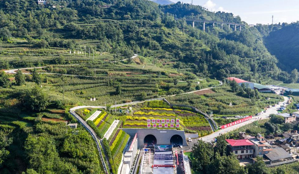 An aerial drone photo taken on Aug. 19, 2025 shows the construction site of Binghui tunnel in Yiliang county of Zhaotong, southwest China's Yunnan Province. As a key project of the Chongqing-Kunming high-speed railway, Binghui tunnel, with a total length of 21.17 kilometers, was successfully completed here on Tuesday.