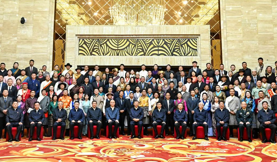 Chinese President Xi Jinping, also general secretary of the Communist Party of China Central Committee and chairman of the Central Military Commission, poses for a group photo while meeting with representatives of cadres who come to work in Xizang from other parts of the country in Lhasa, southwest China's Xizang Autonomous Region, Aug. 20, 2025. (Xinhua/Li Xiang)
