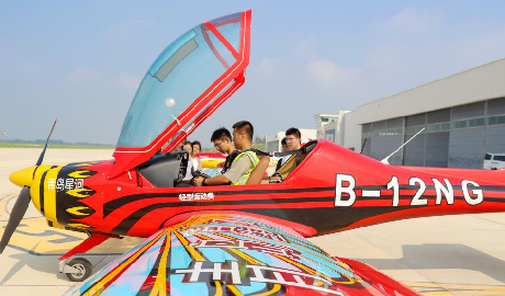 Enthusiasts fly a light-sport aircraft at a general aviation industrial park in Laixi, Qingdao, east China's Shandong Province, Aug. 24, 2025. Laixi City has made efforts in promoting general aviation industry, including establishing a professional industrial park, introducing airplane manufacture companies and developing flight training business, which have activated the vitality of low-altitude economy. (Photo by Zhang Jingang/Xinhua)