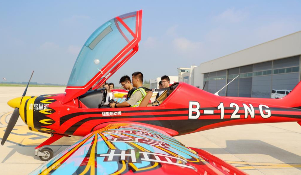 Enthusiasts fly a light-sport aircraft at a general aviation industrial park in Laixi, Qingdao, east China's Shandong Province, Aug. 24, 2025. Laixi City has made efforts in promoting general aviation industry, including establishing a professional industrial park, introducing airplane manufacture companies and developing flight training business, which have activated the vitality of low-altitude economy. (Photo by Zhang Jingang/Xinhua)