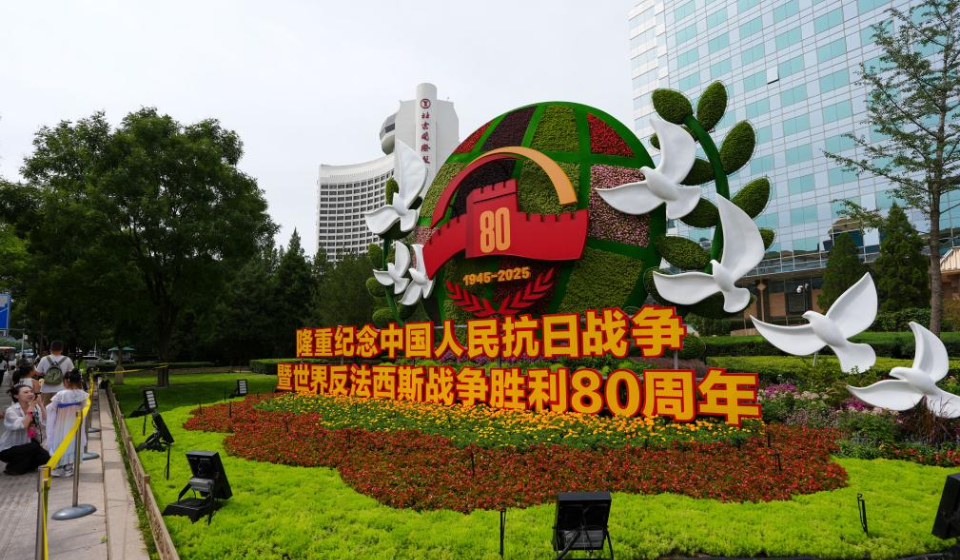 A set of floral installation is pictured at Jianguomen in Beijing, capital of China, Aug. 26, 2025. Ten sets of floral installations along Chang'an Avenue marking the 80th anniversary of the victory in the Chinese People's War of Resistance Against Japanese Aggression and the World Anti-Fascist War have been completed. (Xinhua/Ju Huanzong)