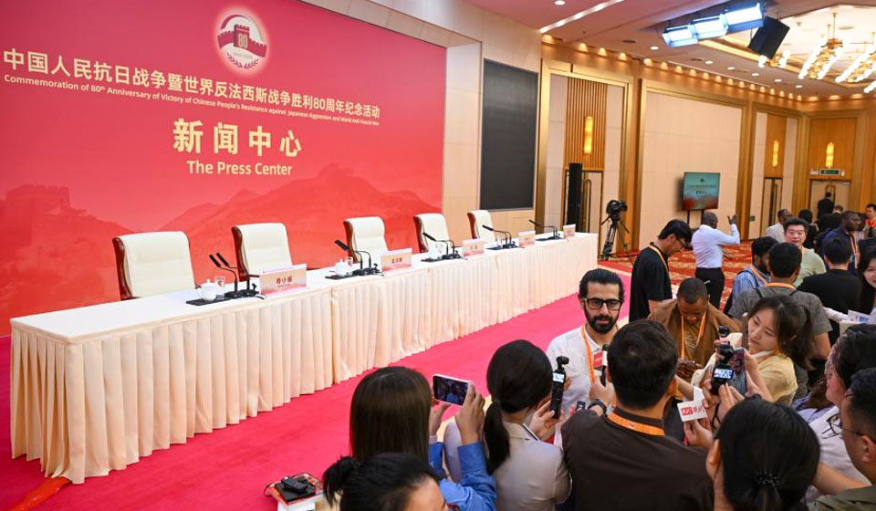 Journalists pose for a group photo at the press center of Commemoration of 80th Anniversary of Victory of Chinese People's Resistance against Japanese Aggression and World Anti-Fascist War in Beijing, capital of China, Aug. 28, 2025. The press center has opened here on Wednesday.