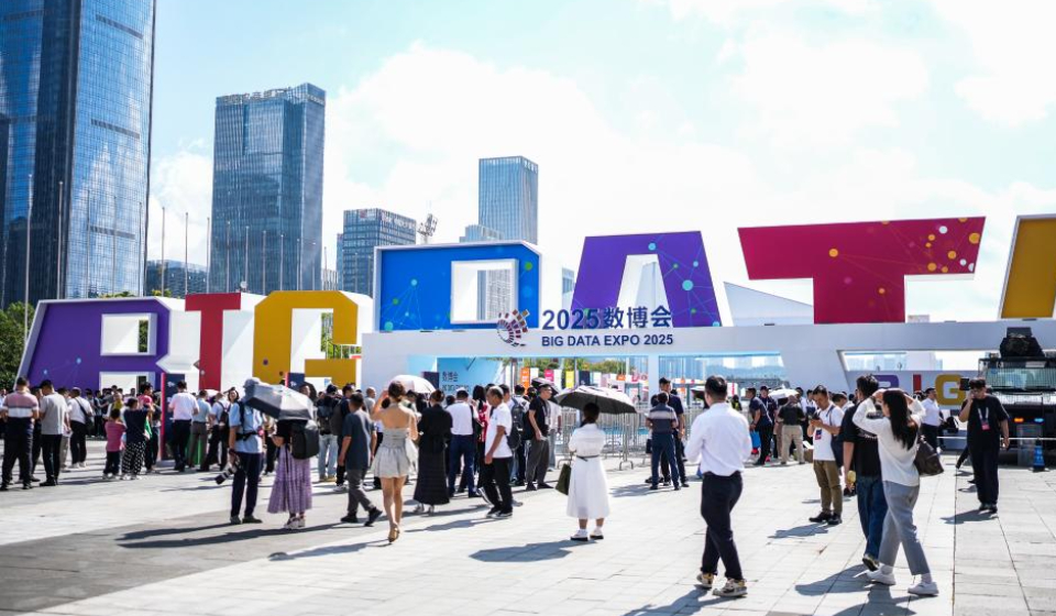 People pose for photos outside the venue of the China International Big Data Industry Expo 2025 in Guiyang, southwest China's Guizhou Province, Aug. 28, 2025. The China International Big Data Industry Expo 2025 opened here on Thursday.