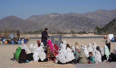 This photo taken on Feb. 12, 2025 shows girls attending a class at a roadside school near Jalalabad City in Nangarhar province, eastern Afghanistan. (Xinhua/Li Ang)