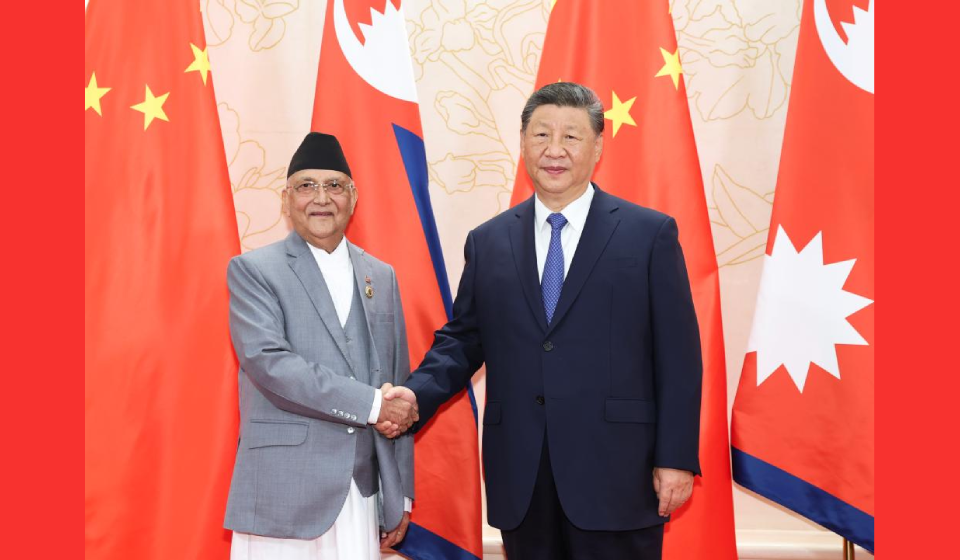 Chinese President Xi Jinping meets with Nepali Prime Minister KP Sharma Oli in Tianjin, north China, Aug. 30, 2025. Oli is in China to attend the Shanghai Cooperation Organization (SCO) Summit 2025, as well as commemorations marking the 80th anniversary of the victory in the Chinese People's War of Resistance against Japanese Aggression and the World Anti-Fascist War. (Xinhua/Zhai Jianlan)