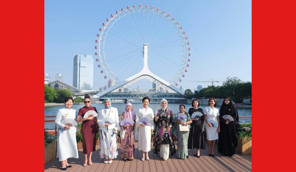 Peng Liyuan, wife of Chinese President Xi Jinping, poses for a group photo with guests in Tianjin, north China, Sept. 1, 2025. Peng on Monday afternoon invited spouses of foreign leaders attending the Shanghai Cooperation Organization (SCO) Summit 2025 to a tour on the Haihe River that winds through the port city of Tianjin. (Xinhua/Zhai Jianlan)