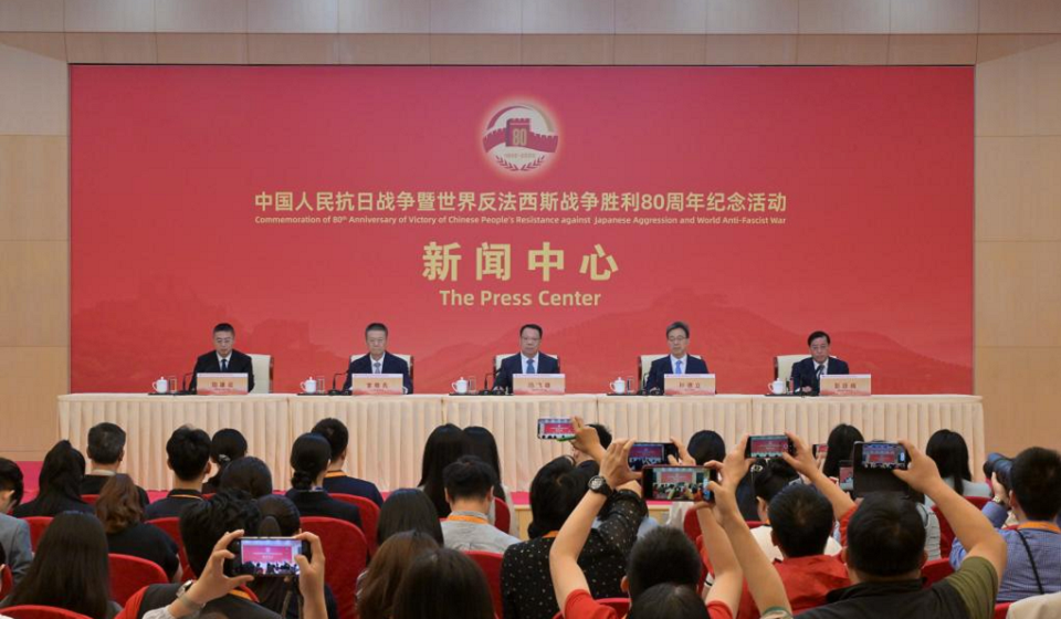 The press center of Commemoration of 80th Anniversary of Victory in Chinese People's Resistance against Japanese Aggression and World Anti-Fascist War holds a press conference in Beijing, capital of China, Aug. 31, 2025. Ma Feixiong, vice minister of the Ministry of Veterans Affairs, and Sun Deli, deputy head of the National Cultural Heritage Administration, introduced newly designated memorial facilities and historical sites related to the War of Resistance, and a new list of heroes from the war at the press conference.