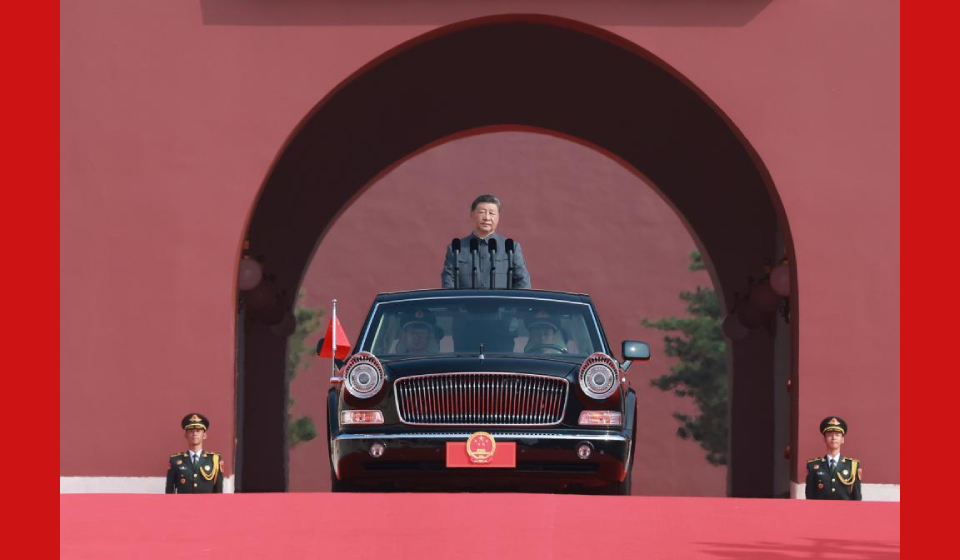Standing in a Hongqi limousine, Xi, also general secretary of the Communist Party of China Central Committee and chairman of the Central Military Commission, gave the command for the review to begin.