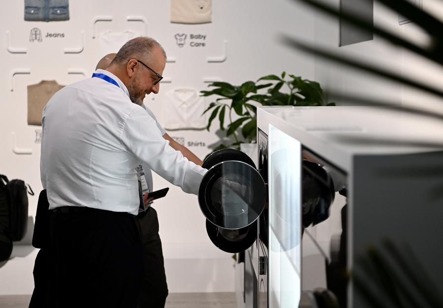 People learn about washing machines at the exhibition area of Hisense at IFA Berlin 2025 in Berlin, Germany, Sept. 5, 2025. IFA Berlin 2025, one of the world's largest trade fairs for consumer electronics and home appliances, opened here on Friday, spotlighting future-oriented themes such as information technology, artificial intelligence, software and computing power, and sustainable solutions for home, mobility, and lifestyle. (Xinhua/Zhang Haofu)