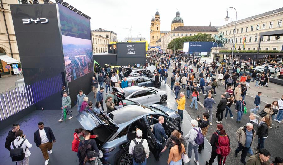 People visit the exhibition zone of BYD at the 2025 IAA Mobility in Munich, Germany, Sept. 9, 2025. (Xinhua/Zhang Fan)
