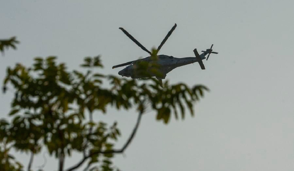 A helicopter is seen near the site of an Israeli airstrike in Doha, Qatar, Sept. 9, 2025. Israel launched an unprecedented airstrike in the Qatari capital of Doha on Tuesday, targeting a building used by senior Hamas officials in what Israeli authorities described as an attempt to assassinate leaders of the group. (Photo by Nikku/Xinhua)