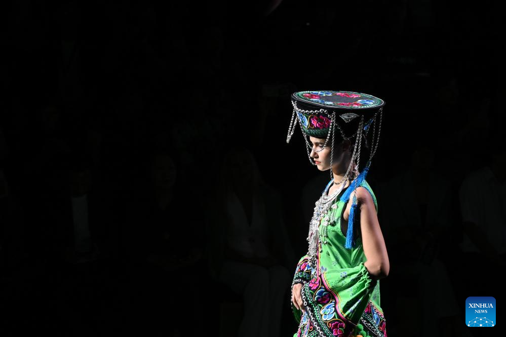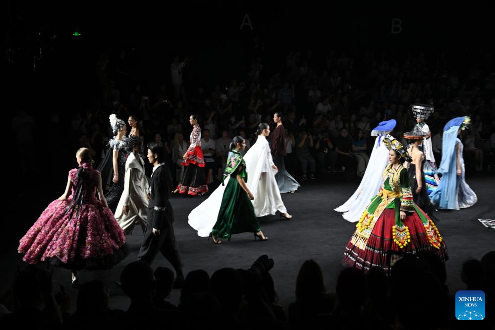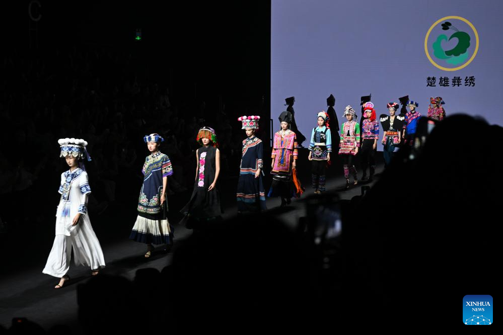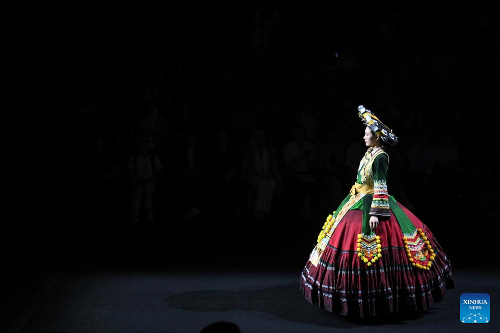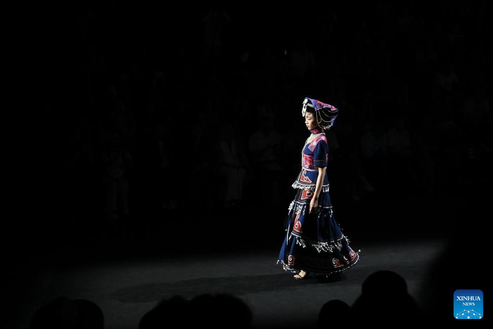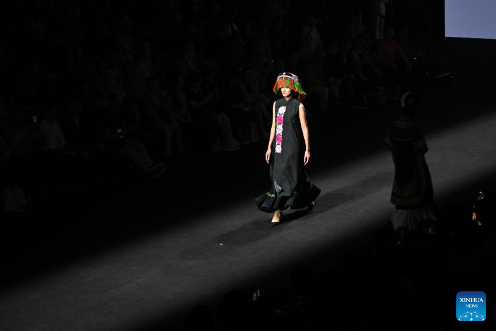 Models present creations featuring embroidery of Yi ethnic group from Chuxiong Yi Autonomous Prefecture of southwest China's Yunnan Province during the 2025 China Fashion Week (Autumn) in Beijing, capital of China, Sept. 8, 2025. (Xinhua/Jin Liangkuai)