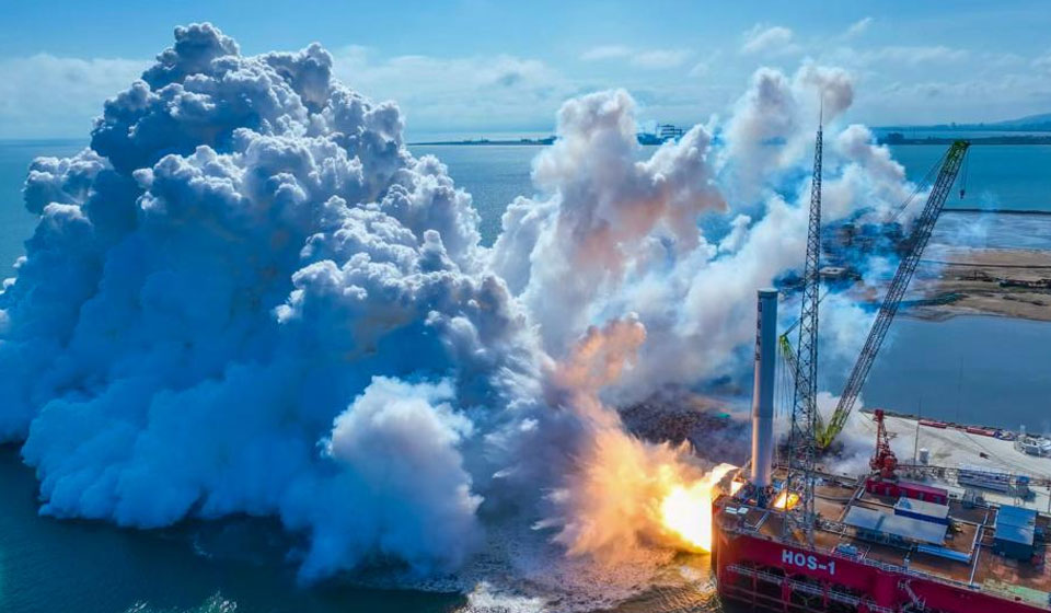 This aerial drone photo taken on Sept. 15, 2025, shows a first-stage propulsion system test for the Tianlong-3 liquid carrier rocket conducted on an offshore launch pad at the Haiyang Oriental Aerospace Port in east China's Shandong Province. A first-stage propulsion system test for the Tianlong-3 large liquid-propellant carrier rocket was successfully held here on Monday.