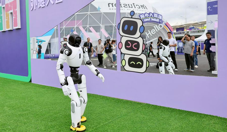 A humanoid robot walks outside the technology exhibition area during the 2025 Inclusion Conference on the Bund in Shanghai, east China, Sept. 10, 2025. (Xinhua/Fang Zhe)