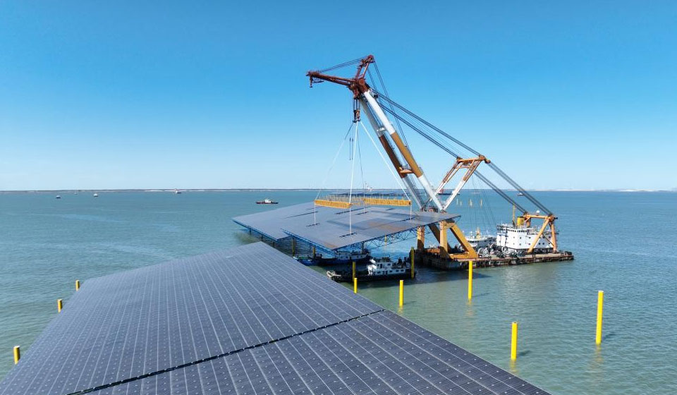 This photo taken on Sept. 18, 2025 shows the construction site of an offshore photovoltaic power plant in Changli County, north China's Hebei Province. At present, a pilot offshore photovoltaic demonstration project of Hebei Province, with a designed installed capacity of 1.8 million kilowatts, is being advanced steadily at the sea area of Changli County.