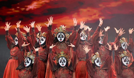 Photo taken on Sept. 16, 2025, shows Miao people in traditional costumes performing the ancient Piao-qin dance at Wanda Town in Danzhai County, Qiandongnan Miao and Dong Autonomous Prefecture, southwest China's Guizhou Province. The day marked the opening of the third China Intangible Cultural Heritage Protection Annual Conference and the fourth Danzhai ICH Week, which presented 205 intangible cultural heritage programs from 22 provincial-level regions across the country. The week-long event, themed "Integrating into Modern Life: Intangible Cultural Heritage and the Times," offered citizens and tourists a feast of performances, food, handicrafts, and folk customs, while exploring new ways for ICH to blend into daily life, empower rural revitalization, and promote cultural tourism integration. (Yang Wukui/Guangming Picture)