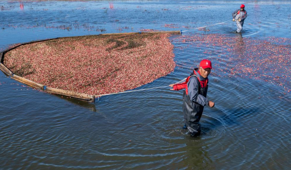 Workers harvest cranberries using flooding techniques at a cranberry planting base in Fuyuan, northeast China's Heilongjiang Province, on Sept. 21, 2025. A cranberry harvest festival was held on Sunday in Fuyuan, a leading hub for large-scale cranberry cultivation in China.