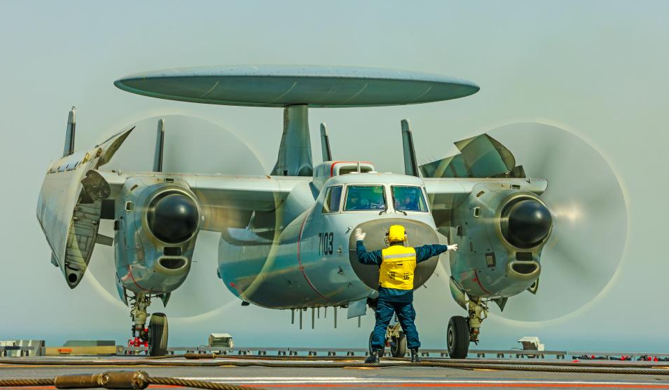 This file photo shows a carrier-based aircraft KongJing-600 making an arrested landing on China's aircraft carrier Fujian. (Photo by Lyu Zhihao/Xinhua)