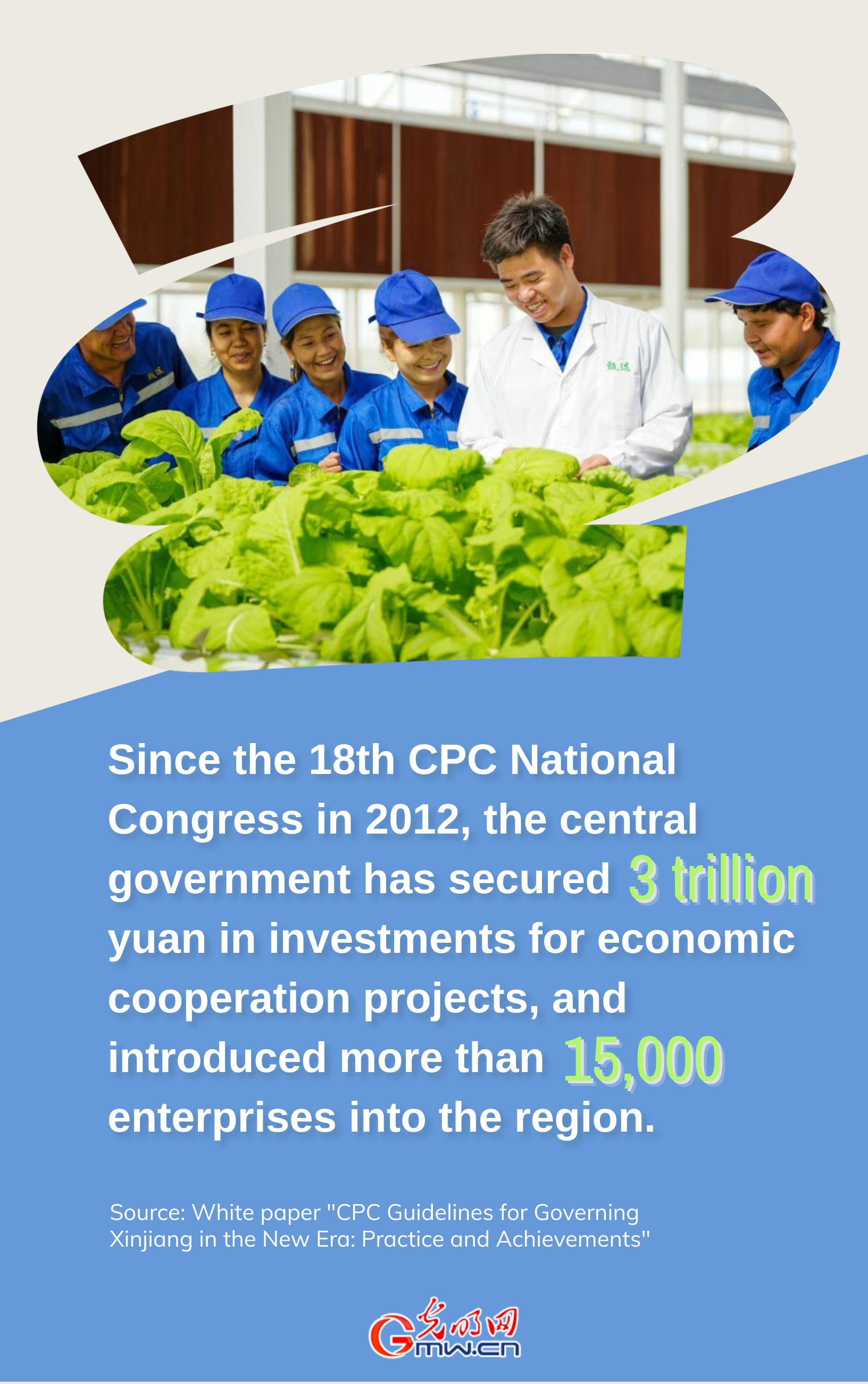 --Since the 18th CPC National Congress in 2012, the central government has allocated over RMB200 billion in paired assistance funds for Xinjiang, secured RMB3 trillion in investments for economic cooperation projects, and introduced more than 15,000 enterprises into the region, helping Xinjiang onto a path of high-quality development.