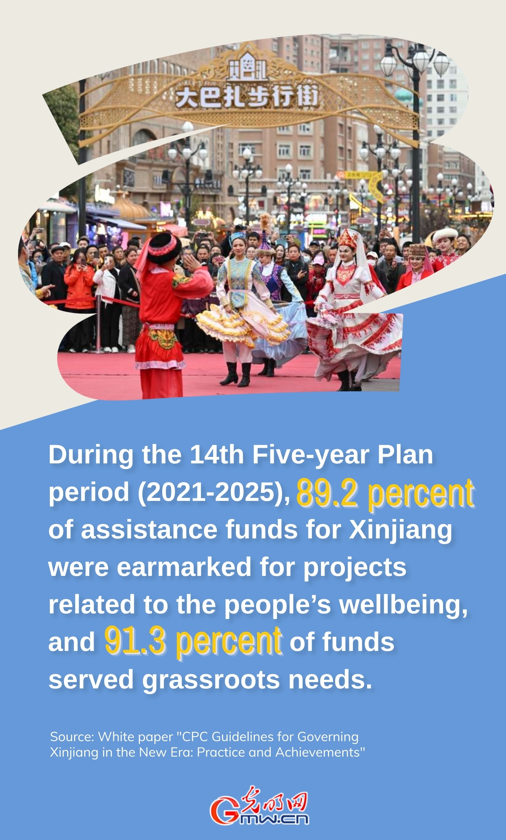 --During the 14th Five-year Plan period (2021-2025), 89.2 percent of assistance funds for Xinjiang were earmarked for projects related to the people’s wellbeing, and 91.3 percent of funds served grassroots needs, improving the welfare of the people from all ethnic groups.