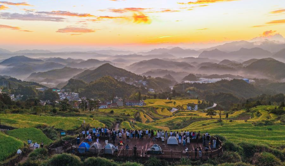 An aerial drone photo taken on Oct. 4, 2025 shows tourists enjoying sunrise scenery at a viewing platform in Tiantai County of Taizhou City, east China's Zhejiang Province. (Photo by Lin Lijun/Xinhua)