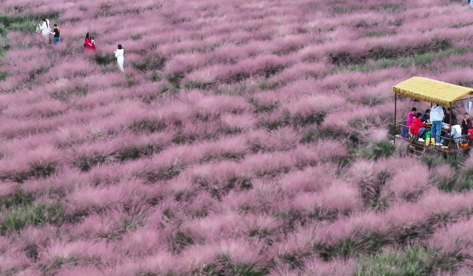An aerial drone photo taken on Oct. 13, 2025 shows tourists having fun amid flowers at a farm in Yizheng City, east China's Jiangsu Province. (Photo by Qi Liguang/Xinhua)