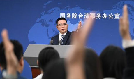 Chen Binhua, a spokesperson for the Taiwan Affairs Office of the State Council, gestures at a press conference in Beijing, capital of China, Oct. 15, 2025. (Xinhua/Chen Yehua)