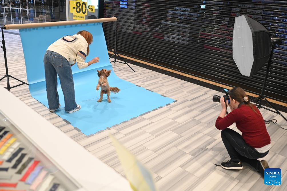 A photographer takes photos for a woman and her dog during the "Pupilove" charity pet supplies sale in Warsaw, Poland, Oct. 19, 2025. The charity sale, in cooperation with local animal protection organizations, is regularly held to support animal shelters in several cities in Poland. (Photo by Aleksy Witwicki/Xinhua)