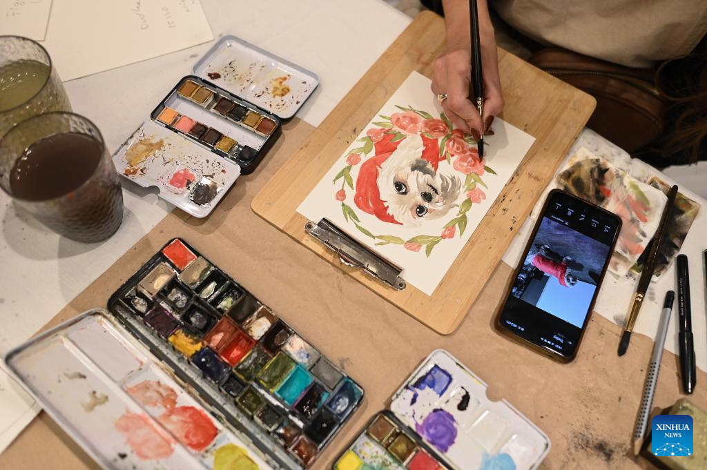 An artist paints a dog-themed watercolor during the "Pupilove" charity pet supplies sale in Warsaw, Poland, Oct. 19, 2025. The charity sale, in cooperation with local animal protection organizations, is regularly held to support animal shelters in several cities in Poland. (Photo by Aleksy Witwicki/Xinhua)