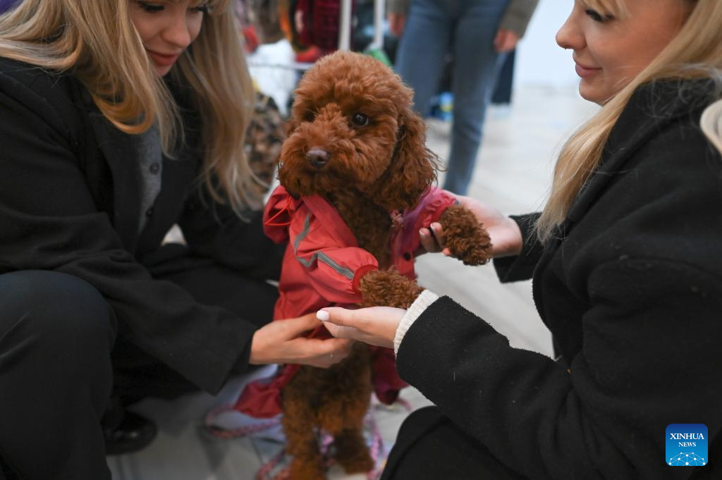 People interact with a dog during the "Pupilove" charity pet supplies sale in Warsaw, Poland, Oct. 19, 2025. The charity sale, in cooperation with local animal protection organizations, is regularly held to support animal shelters in several cities in Poland. (Photo by Aleksy Witwicki/Xinhua)