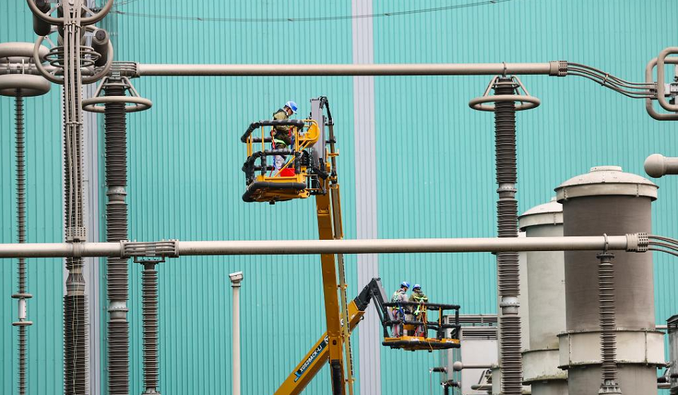 Staff members conduct maintenance work at the Guquan converter station in Xuancheng, east China's Anhui Province, Oct. 19, 2025. The Guquan converter station on the Changji-Guquan ultra-high voltage direct current (UHVDC) transmission line that transmits electricity from Xinjiang to east China is undergoing a 7-day annual overhaul started from Oct. 17.