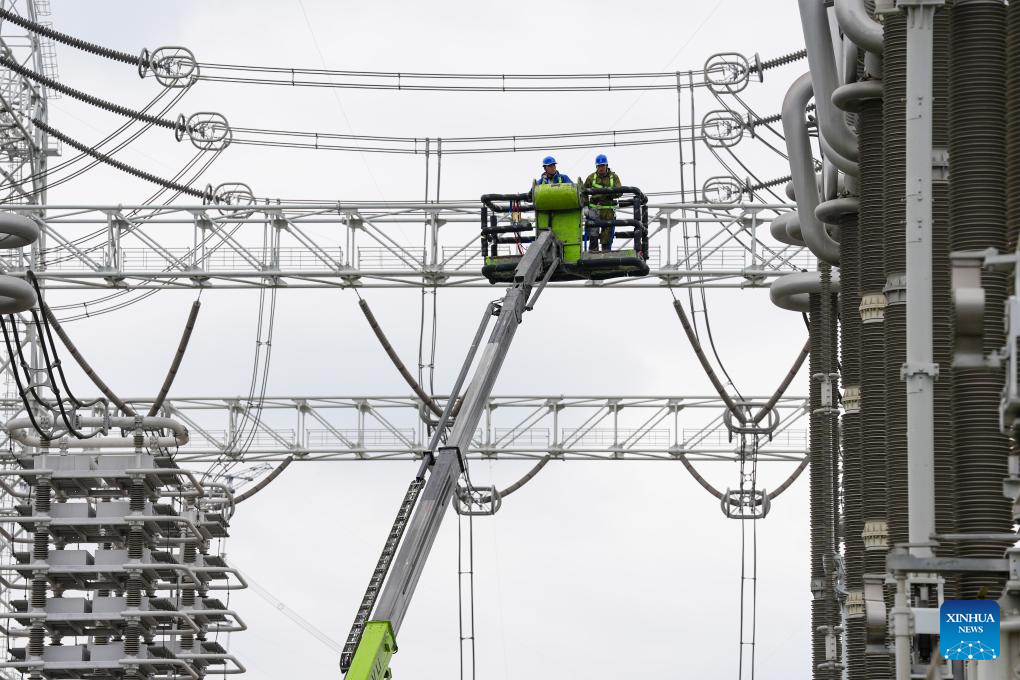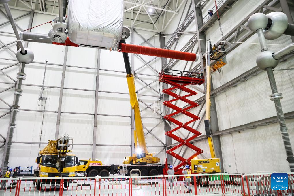 Staff members conduct maintenance work at the Guquan converter station in Xuancheng, east China's Anhui Province, Oct. 20, 2025. The Guquan converter station on the Changji-Guquan ultra-high voltage direct current (UHVDC) transmission line that transmits electricity from Xinjiang to east China is undergoing a 7-day annual overhaul started from Oct. 17.