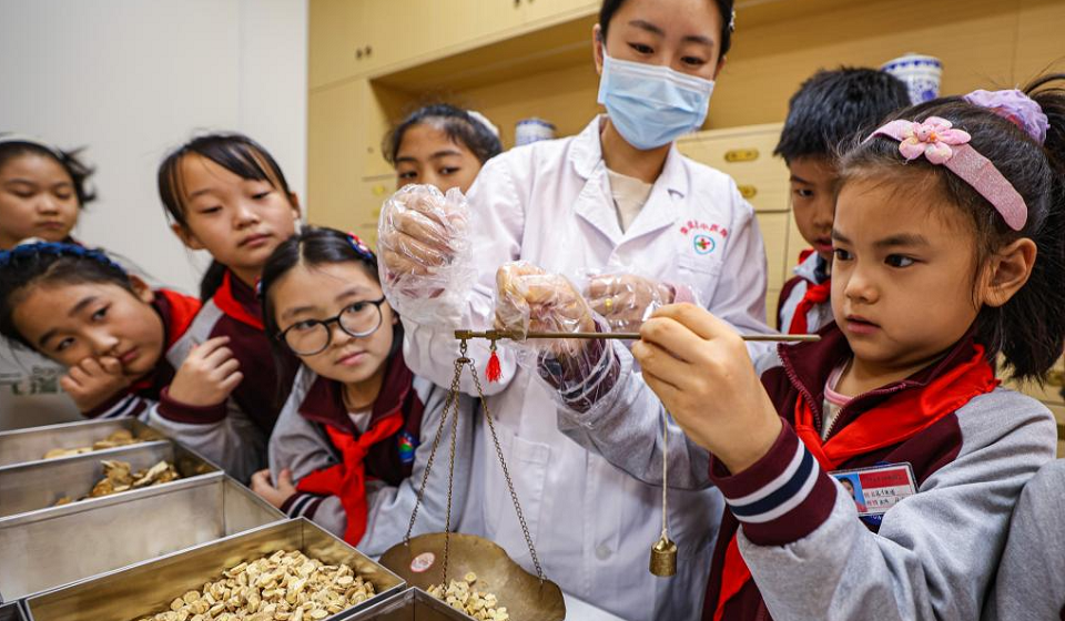 Students measure herbs of traditional Chinese medicine (TCM) at an elementary school in Taizhou City, east China's Jiangsu Province, Oct. 22, 2025. Lessons on TCM were introduced in various ways across the country to welcome the annual World Traditional Medicine Day which falls on Oct. 22. (Photo by Zhou Shegen/Xinhua)