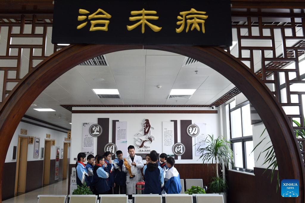 A traditional Chinese medicine (TCM) instructor explains acupuncture points and massage benefits to elementary school students at a hospital in Xiayi County, Shangqiu City, central China's Henan Province, Oct. 21, 2025. Lessons on TCM were introduced in various ways across the country to welcome the annual World Traditional Medicine Day which falls on Oct. 22. (Photo by Miao Yucai/Xinhua)