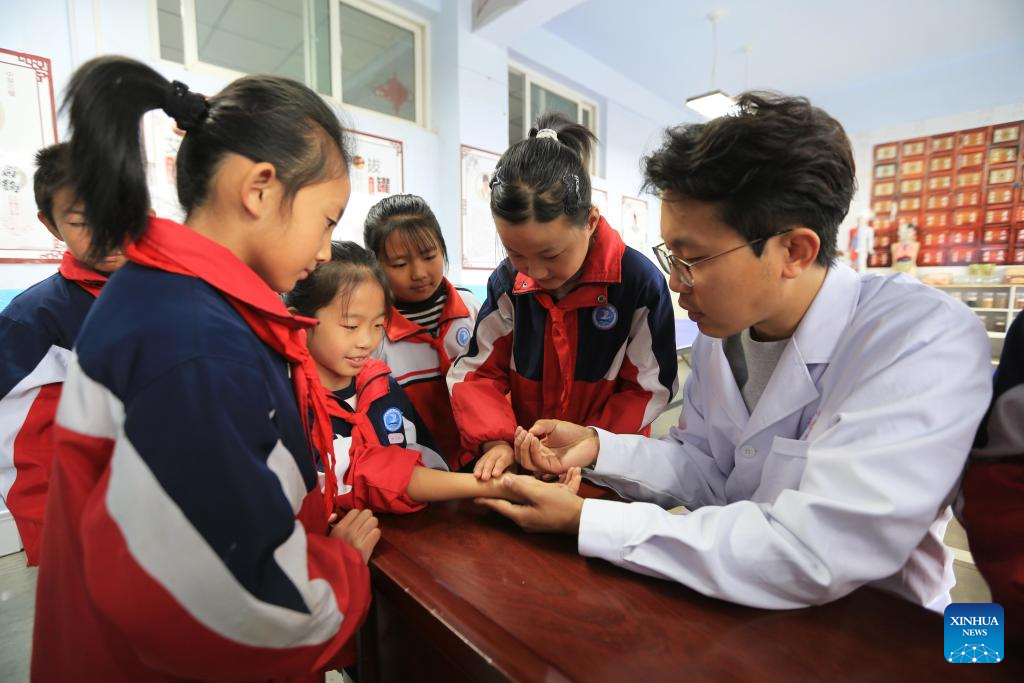 A doctor guides students to experience pulse diagnosis at a primary school in Anding District of Dingxi City, northwest China's Gansu Province, Oct. 22, 2025. Lessons on traditional Chinese medicine were introduced in various ways across the country to welcome the annual World Traditional Medicine Day which falls on Oct. 22. (Photo by Wang Kexian/Xinhua)