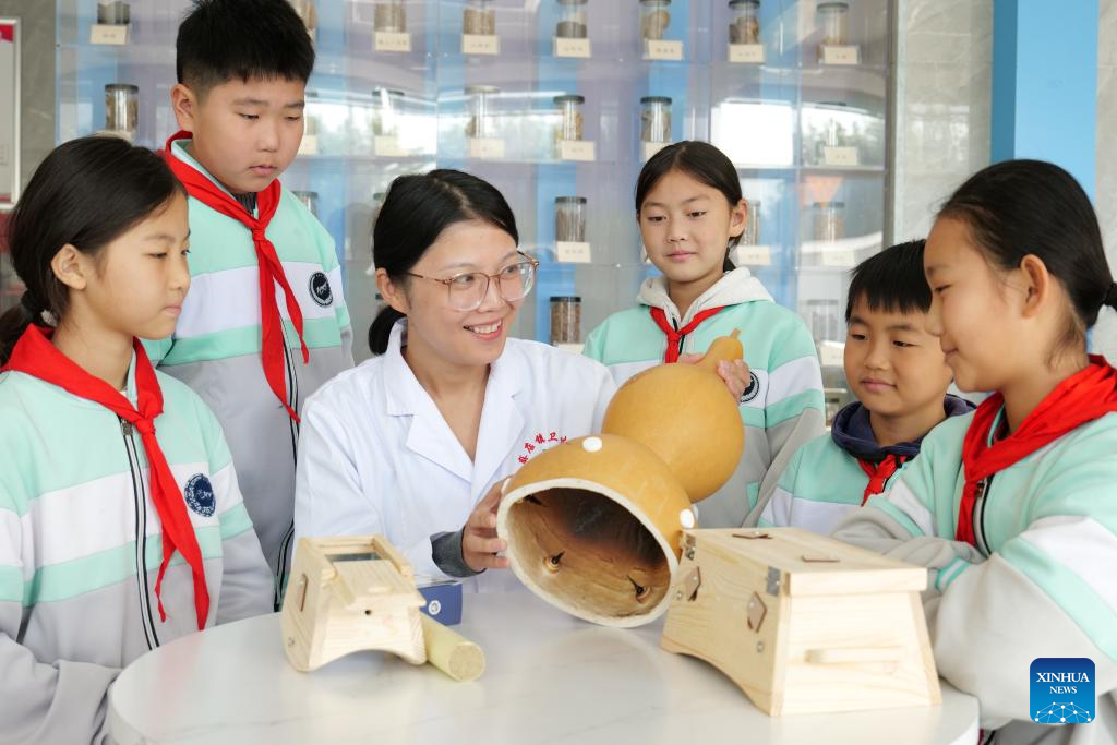 A doctor explains the usage of traditional Chinese medicine (TCM) tools to children at a local elementary school in Huimin County of Binzhou City, east China's Shandong Province, Oct. 21, 2025. Lessons on TCM were introduced in various ways across the country to welcome the annual World Traditional Medicine Day which falls on Oct. 22. (Photo by Wang Jun/Xinhua)
