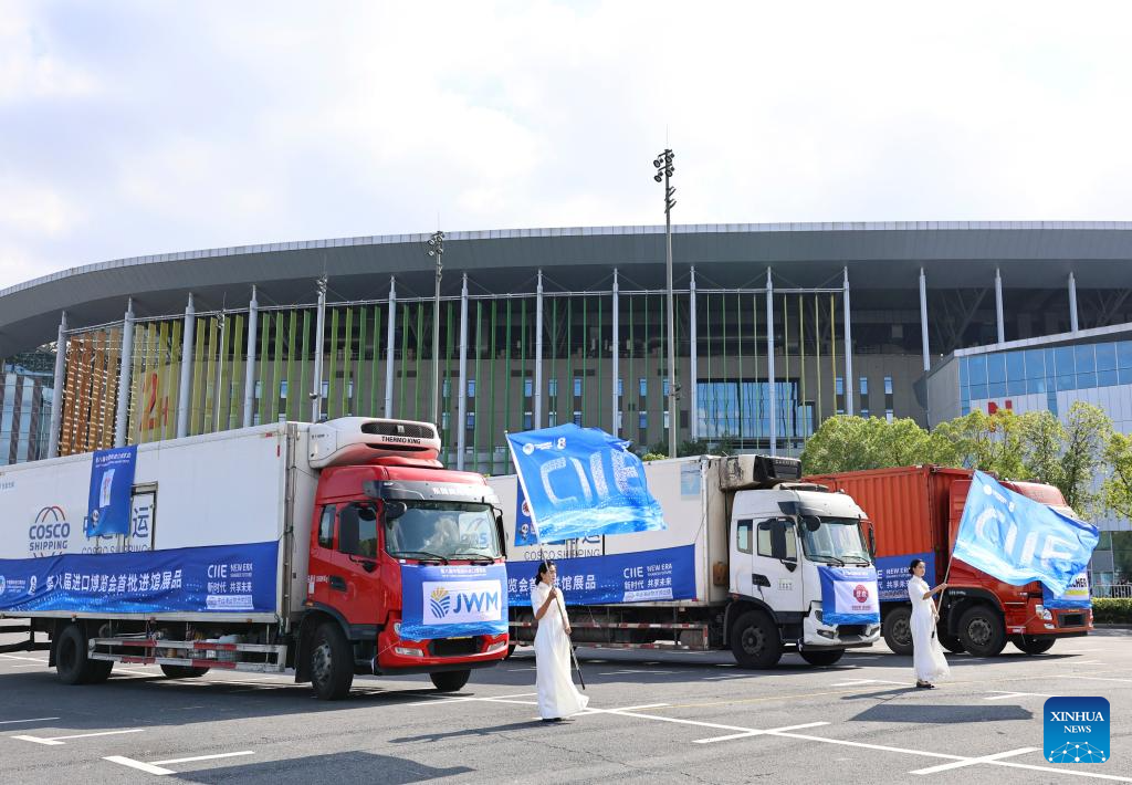 Trucks loaded with exhibits for the upcoming 8th China International Import Expo (CIIE) are seen during a ceremony marking the arrival of exhibits at the National Exhibition and Convention Center (Shanghai), the main venue for the CIIE, in east China's Shanghai, Oct. 23, 2025. The first batch of exhibits for the exhibition areas of Intelligent Industry and Information Technology, Food and Agricultural Products, and Medical Equipment &Healthcare Products of the 8th CIIE arrived at the National Exhibition and Convention Center (Shanghai) on Thursday. (Xinhua/Fang Zhe)