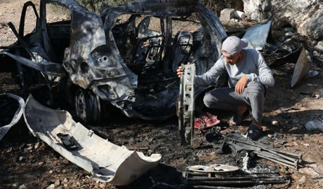 A Palestinian inspects the site where three Palestinians were killed by the Israeli forces in the village of Kafr Qud, west of Jenin, in the northern West Bank, Oct. 28, 2025. Three Palestinian men were killed by the Israeli forces on Tuesday in the west of Jenin in the northern West Bank, the Palestinian health ministry said. (Photo by Nidal Eshtayeh/Xinhua)