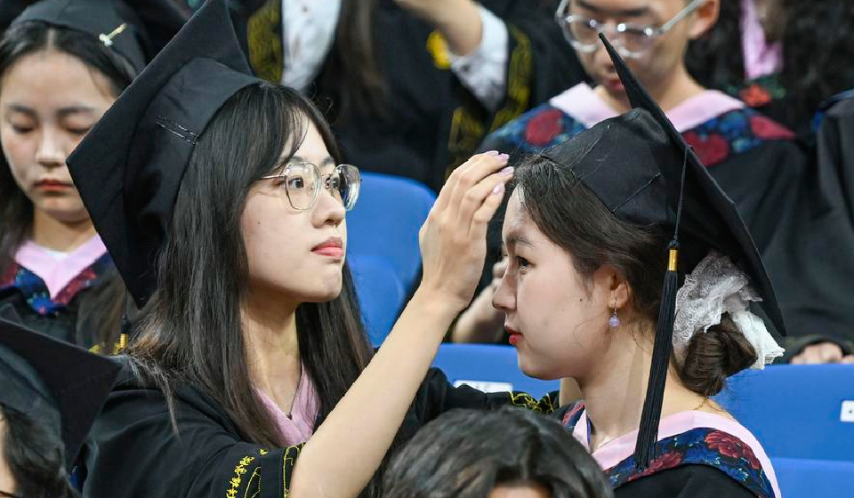A graduate adjusts the mortarboard for a fellow student before the graduation ceremony at Peking University in Beijing, capital of China, July 2, 2025. (Xinhua/Chen Shuo)